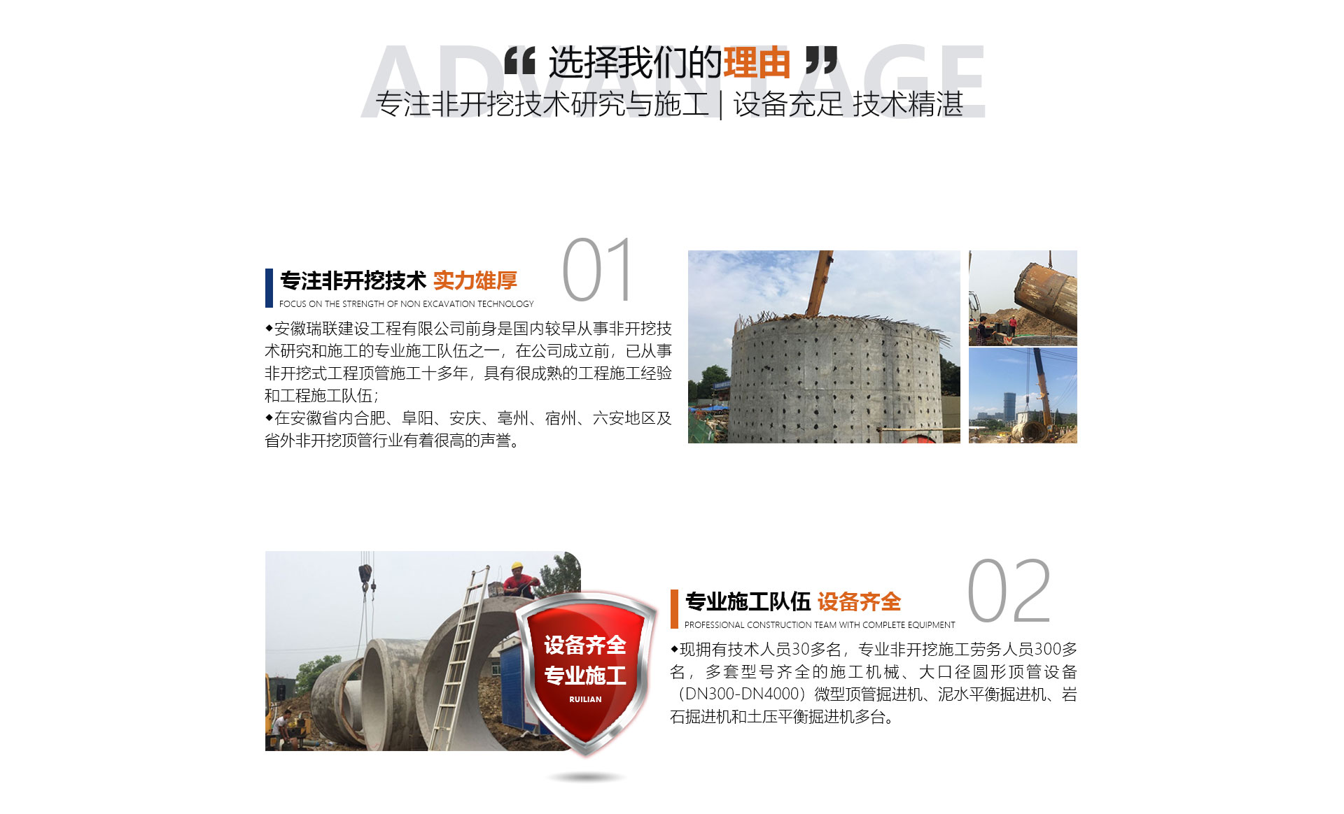 安徽瑞聯(lián)建設工程有限公司前身是國內較早從事非開挖技術研究和施工的施工隊伍之一,在公司成立前,已從事非開挖式工程頂管施工十多年,具有很成熟的工程施工經驗和工程施工隊伍,在安徽省內合肥、阜陽、安慶、亳州、宿州、六安地區(qū)及省外非開挖頂管行業(yè)有著很高的聲譽。面對日益擴大的市場,公司于2014年正式成立,公司擁有勞務分包及市政公用工程總承包資質。公司優(yōu)勢(文字):現擁有中高技術人員30多名,非開挖施工勞務人員300...